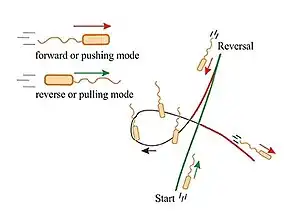 Besides these 180° reversals, the cells can reorient (a "flick") by an angle around 90°, referred to as turning by buckling.[58][54] Rhodobacter sphaeroides with its subpolar monotrichous flagellation, represents yet another motility strategy:[55][24] the flagellum only rotates in one direction, and it stops and coils against the cell body from time to time, leading to cell body reorientations,[56][59][60] In the soil bacterium Pseudomonas putida, a tuft of helical flagella is attached to its posterior pole. P. putida alternates between three swimming modes: pushing, pulling, and wrapping.[57][3]