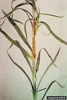 B. caryophylli infects many different species of the Dianthus plant genus. The species Dianthus barbatus (sweet William) and Dianthus alwoodii (allwoodii hybrids) can be infected through induced artificial inoculation in a lab setting,[5] however, the pathogen only naturally infects the species D. caryophyllus (carnation). If infected, the pathogen induces symptoms on the host such as the discoloration of leaves and stems; they become grayish-green with subsequent yellowing. This initial leaf and stem discoloration is usually followed by plant wilting and death. Stem bases may also show internodal stem cracking, developing into small areas of dead tissue, which grow slowly over years (cankers). Cutting diseased stems often reveals brownish-yellow bacterial ooze.[3] The wilting of the plant signifies the presence of rotten roots. This causes a significant decrease in the plants ability to anchor itself into the soil. Symptoms can take up to 2–3 years to surface. Visual symptoms are most readily seen in mature plants by inspection of aerial parts.[3] Although there may be an extended period of latency, once plants begin showing symptoms, death typically occurs within 1–2 months. The contraction of bacterial wilt of carnation is often followed by secondary fungal invasions and disease.