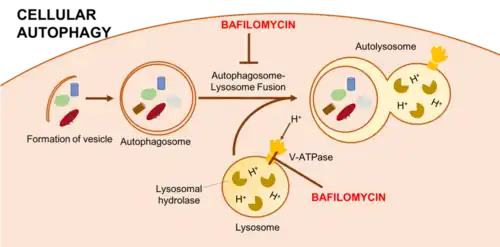 Bafilomycin A1 is most known for its use as an autophagy inhibitor.[12][22] Autophagy is the process by which the cell degrades its own organelles and some proteins through the formation of autophagosomes. Autophagosomes then fuse with lysosomes facilitating the degradation of engulfed cargo by lysosomal proteases. This process is critical in maintaining the cell's store of amino acids and other nutrients during times of nutrient deprivation or other metabolic stresses.[23] Bafilomycin interferes with this process by inhibiting the acidification of the lysosome through its interaction with V-ATPase. Lack of lysosomal acidification prevents the activity of lysosomal proteases like cathepsins so that engulfed cargo can no longer be degraded.[22]