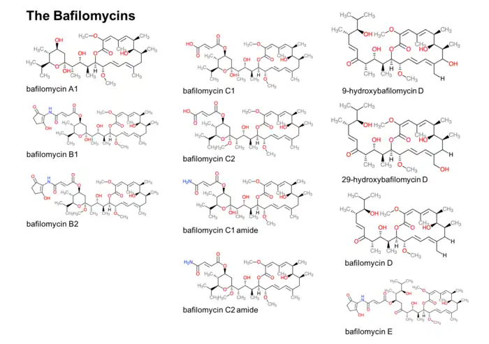 The bafilomycins are a family of macrolide antibiotics produced from a variety of Streptomycetes. Their chemical structure is defined by a 16-membered lactone ring scaffold.[2] Bafilomycins exhibit a wide range of biological activity, including anti-tumor,[3] anti-parasitic,[4][5] immunosuppressant[6] and anti-fungal[7] activity. The most used bafilomycin is bafilomycin A1, a potent inhibitor of cellular autophagy. Bafilomycins have also been found to act as ionophores, transporting potassium K+ across biological membranes and leading to mitochondrial damage and cell death.[8]