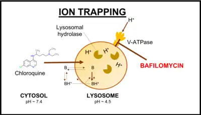 When one of these drugs is co-applied to cells with bafilomycin A1, the action of bafilomycin A1 prevents the acidification of the lysosome, therefore preventing the phenomenon of ion trapping in this compartment.[34] As the lysosome cannot acidify, lysosomotropic drugs do not become protonated and subsequently trapped in the lysosome in the presence of bafilomycin. Additionally, when cells are preloaded with lysosomotropic drugs in vitro, then treated with bafilomycin, bafilomycin acts to release the cationic compound from its accumulation in the lysosome.[21]