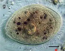 | Balantidium coli trophozoite Scale bar: 5 μm. | |