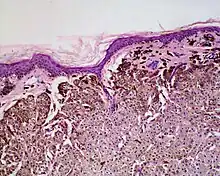 Histologically it is characterized by swollen, pale, polyhedral melanocytes, with pale cytoplasm and a central nucleus.[2] It is different to balloon cell melanoma,[3] which has larger nuclei and is structured like a melanoma.[1]