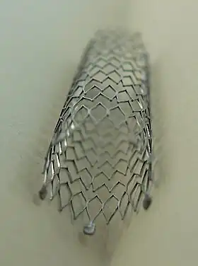 A bare-metal stent is a stent made of thin, uncoated (bare) metal wire that has been formed into a mesh-like tube. The first stents licensed for use in cardiac arteries were bare metal – often 316L stainless steel. More recent "second generation" bare-metal stents have been made of cobalt chromium alloy.[1] While plastic stents were first used to treat gastrointestinal conditions of the esophagus, gastroduodenum, biliary ducts, and colon, bare-metal stent advancements led to their use for these conditions starting in the 1990s.[2]