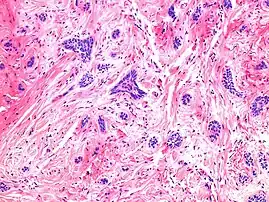 | Morpheaform basal-cell carcinoma (also known as "cicatricial basal-cell carcinoma", and "morphoeic basal-cell carcinoma") | Narrow strands and nests of basaloid cells, surrounded by dense sclerotic stroma.[33] | Aggressive[30]: 748 [31]: 647 | ![]() |
