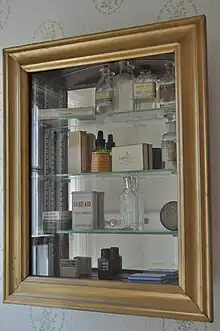 Some bathrooms contain a bathroom cabinet for personal hygiene products and medicines, and drawers or shelves (sometimes in column form) for storing towels and other items.[5]