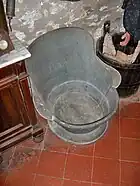 A bathtub, also known simply as a bath or tub, is a container for holding water in which a person or another animal may bathe. Most modern bathtubs are made of thermoformed acrylic, porcelain-enameled steel or cast iron, or fiberglass-reinforced polyester. A bathtub is placed in a bathroom, either as a stand-alone fixture or in conjunction with a shower.