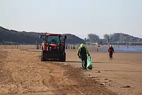 The process of beach cleaning requires good management methods, adequate human resources, and funds.[1] Solid litters cleaning methods are very different than oil spill cleaning methods.[50][51] The beach cleaning process may be done using machinery such as sand cleaning machines that rake or sift the sand or/and other chemicals such as oil dispersants.[52][53] This beach cleaning may be done by professionals company, civic organizations, the military or volunteers such as the Great Canadian Shoreline Cleanup and Marine Conservation Society.