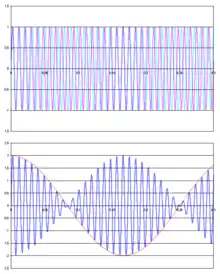 Because every other burst in the modulation pattern is inverted, each peak is replaced by a trough and vice versa. The envelope is perceived to have twice the frequency of the modulating cosine, which means the audible beat frequency (if it is in the audible range) is:[4]
