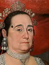 The wearing of artificial beauty marks trace back to the Roman Empire; it was believed that the Goddess of beauty, Venus, had a single beauty mark that accentuated her beauty.[3] As such, beauty patches became a recognizable symbol of beauty designed to highlight the pale, unblemished skin of the wearer.[4] In Europe, mouches (French, 'flies'), became fashionable in sixteenth-century France, and the fashion persisted into the eighteenth century. When the fashion spread to Spain and the Spanish Empire they were called a chiqueador.[5]