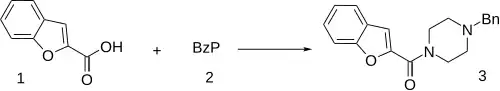 A one-step coupling between coumarilic acid (benzofuran-2-carboxylic acid) [496-41-3] (1) and benzylpiperazine (BzP) (2) gives an amide, and hence Befuraline (3).