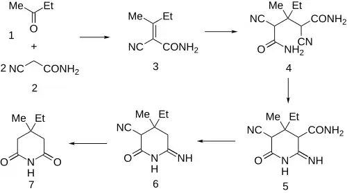 The original synthesis involves first the condensation of methylethylketone with two equivalents of cyanoacetamide. The product can be rationalized by assuming first aldol condensation of ketone and active methylene compound followed by dehydration to give 3. Conjugate addition of a second molecule of cyanoacetamide would afford 4. Addition of one of the amide amines to the nitrile would then afford the iminonitrile 5. The observed product 6 can be rationalized by assuming loss of the carboxamide under strongly basic conditions. Decarboxylative hydrolysis of 6 then leads to bemegride 7.