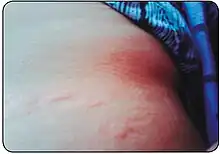 Side effects tend to be common and occur more frequently with increased age.[4] The most common adverse reactions associated with benznidazole are allergic dermatitis and peripheral neuropathy.[1] It is reported that up to 30% of people will experience dermatitis when starting treatment.[14][16] Benznidazole may cause photosensitization of the skin, resulting in rashes.[1] Rashes usually appear within the first 2 weeks of treatment and resolve over time.[16] In rare instances, skin hypersensitivity can result in exfoliative skin eruptions, edema, and fever.[16] Peripheral neuropathy may occur later on in the treatment course and is dose dependent.[1] It is not permanent, but takes time to resolve.[16]