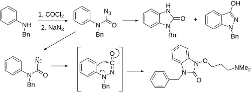 15. Baiocchi L, Corsi G, Palazzo G (1965). "Ricerche nel campo degli indazoli.—Nota 1. Sulla ciclizzazione termica di azidi di acidi N-aril-N-benzil-carbamici". Annali di Chimica. 55: 116–25.