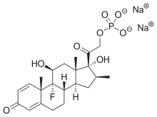 Betamethasone sodium phosphate is a synthetic glucocorticoid corticosteroid and a corticosteroid ester.[1] It is the disodium salt of the phosphate ester of betamethasone.