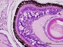 Viral nervous necrosis can have a clinical or sub-clinical presentation. Signs include: abnormal behaviour like lethargy, anorexia, spiral swimming; and change in pigmentation. Mortalities of affected populations can be of up to 100%.[11] Microscopical lesions are mostly located in brain, retina and spinal cord where necrosis of the neurons and the presence of round empty spaces called vacoules are commonly associated with the disease.