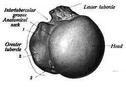 - 1 2 3 Wafae, Nader; Atencio Santamaría, Luciany Everardo; Vitor, Leonardo; Pereira, Luiz Antonio; Ruiz, Cristiane Regina; Wafae, Gabriela Cavallini (2010-01-01). "Morphometry of the human bicipital groove (sulcus intertubercularis)". Journal of Shoulder and Elbow Surgery. 19 (1): 65–68. doi:10.1016/j.jse.2009.05.005. ISSN 1058-2746. PMID 19574066.
