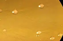 | Close view of Petri dish culture plate containing brain heart infusion (BHI) agar growth medium, inoculated with Bifidobacterium bifidum which, after a 42–72hr incubation period, has developed dewdrop-type bacterial colonies | |