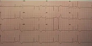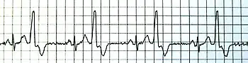 Bigeminy is a cardiac arrhythmia in which there is a single ectopic beat, or irregular heartbeat, following each regular heartbeat. Most often this is due to ectopic beats occurring so frequently that there is one after each sinus beat, or normal heartbeat. The two beats are figuratively similar to two twins (hence bi- + gemini). For example, in ventricular bigeminy, a sinus beat is shortly followed by a premature ventricular contraction (PVC), a pause, another normal beat, and then another PVC.[1] In atrial bigeminy, the other "twin" is a premature atrial contraction (PAC).