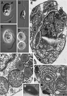 - ↑ Aleoshin; et al. (2016), "Heterokont Predator Develorapax marinus gen. et sp. nov.- A Model of the Ochrophyte Ancestor", Front Microbiol, 7 (1194): 1194, doi:10.3389/fmicb.2016.01194, PMC 4971089, PMID 27536283