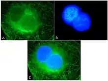 Binucleated cells can be observed using microscopy. Cells must first be fixed to arrest them wherever they are in the cell cycle and to keep their structures from degrading. Their nuclei and tubulin must next be made visible so that binucleation can be identified. DAPI is a dye that binds to DNA and fluoresces blue. For this reason, it is particularly useful at labeling nuclei. Antibody probes can be used to label tubulin fluorescently. The immunofluorescence may then be observed with microscopy. Binucleated cells are most easily identified by viewing tubulin, which surrounds the two nuclei in the cell. Binucleated cells may be mistaken for two cells in close proximity when viewing only nuclei.