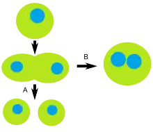 - Merging of newly formed cells: Two cells that have just finished cytokinesis merge into one another. This process is not entirely understood.[1]