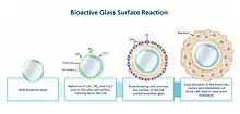 - ↑ Velez, Steven AyotteJon (2016-04-16), English: The integration of Bioglass with bone is shown in the image. The reaction with surrounding physiological fluid at the surface of Bioglass is shown in first two steps, and the formation of new bone is shown in the last two stages., retrieved 2020-11-13