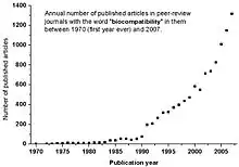 The word biocompatibility seems to have been mentioned for the first time in peer-review journals and meetings in 1970 by RJ Hegyeli (Amer Chem Soc Annual Meeting abstract) and CA Homsy.[8] It took almost two decades before it began to be commonly used in scientific literature (see the graph below).