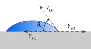 where , , and are the interfacial energies of the solid–liquid, the liquid–vapor, and the solid–vapor interfaces, respectively. Using this equation, can be determined.