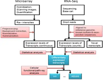 The expression of many genes can be determined by measuring mRNA levels with multiple techniques including microarrays, expressed cDNA sequence tag (EST) sequencing, serial analysis of gene expression (SAGE) tag sequencing, massively parallel signature sequencing (MPSS), RNA-Seq, also known as "Whole Transcriptome Shotgun Sequencing" (WTSS), or various applications of multiplexed in-situ hybridization. All of these techniques are extremely noise-prone and/or subject to bias in the biological measurement, and a major research area in computational biology involves developing statistical tools to separate signal from noise in high-throughput gene expression studies.[48] Such studies are often used to determine the genes implicated in a disorder: one might compare microarray data from cancerous epithelial cells to data from non-cancerous cells to determine the transcripts that are up-regulated and down-regulated in a particular population of cancer cells.