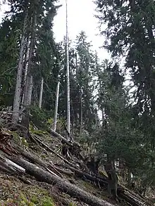 Old trees absorb more CO2 than young trees because of the larger leaf area in full-grown trees.[76] However, the old forest (as a whole) will eventually stop absorbing CO2 because CO2 emissions from dead trees cancel out the remaining living trees' CO2 absorption.[ay] The old forest (or forest stands) are also vulnerable for natural disturbances that produces CO2. The IPCC found that "[...] landscapes with older forests have accumulated more carbon but their sink strength is diminishing, while landscapes with younger forests contain less carbon but they are removing CO2 from the atmosphere at a much higher rate [...]."[65]: 386