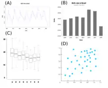 In the bar chart example, we have the birth rate in Brazil for the December months from 2010 to 2016.[9] The sharp fall in December 2016 reflects the outbreak of Zika virus in the birth rate in Brazil.