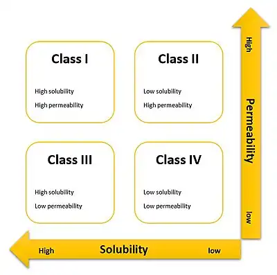 According to the Biopharmaceutics Classification System (BCS) drug substances are classified to four classes upon their solubility and permeability:[1]