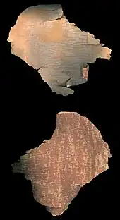 In India, the birch (Sanskrit: भुर्ज, bhurja) holds great historical significance in the culture of North India, where the thin bark coming off in winter was extensively used as writing paper. Birch paper (Sanskrit: भुर्ज पत्र, bhurja patra) is exceptionally durable and was the material used for many ancient Indian texts.[21][22] The Roman period Vindolanda tablets also use birch as a material on which to write and birch bark was used widely in ancient Russia as notepaper (beresta) and for decorative purposes and even making footwear (lapti) and baskets.