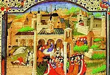 In March 1348, the plague reached Florence, lasting until July.[1] Neither formally educated medical doctors nor the traditional male and female folk healers and medical practitioners could do anything about it.[1] The infected died within 3 days. People were infected by the smallest contact, even with the clothes or other objects handled by the ill.[1] Boccaccio witnessed dead bodies being thrown out upon the streets, after which the animals who started to touch them fell dead.[1] Priests and other authorities died so swiftly that the administration and law and order collapsed.[1] People refused to bury their dead, who were instead buried by a special group of grave diggers recruited from the poorest beggars, the becchini, who charged enormous sums to throw the bodies in mass graves.[1] Those who couldn't pay left the bodies on the street, which were soon full of rotting corpses.[1] In the countryside outside Florence, the peasantry fell dead in their fields which were abandoned by the living, who let loose their animals and ate their supplies because they lost any hope of surviving.[1] Matteo Villani described how people in Florence, expecting their death, lived to enjoy life without consequences: the poor ignored the class system. They started to eat luxury food and dress in the fashion of dead aristocrats, and people started to marry anyone they wished without considering class, status, or suitability.[1]
