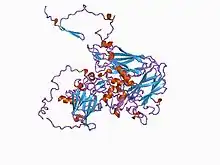 The black queen cell virus contains 60 copies of the capsid proteins VP1, VP2, and VP3.[6] The capsid is the shell of the virus that holds the virus's genetic material. VP4 proteins, which are sometimes also found in the capsid, do not affect the virus's infectivity,[6] or ability to be transmitted. The surface of the virion has large protrusions, which are formed by the VP1 and VP3 proteins and are located between the 5- and 3-fold axes of the icosahedral capsid.[6] An icosahedral capsid is formed from 20 triangular faces, put together in such a way that it resembles a sphere.[11] The axes are found where the faces come together.