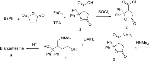 The reaction between benzophenone [119-61-9] and succinic anhydride [108-30-5] in the presence of zinc chloride give 2,2-Diphenyloxolane-3-carboxylic acid, PC151808451 (1). The halogenation of with thionyl chloride (2) followed by dimethylamine gives the amide and hence N,N-dimethyl-5-oxo-2,2-diphenyloxolane-3-carboxamide, PC15187451 (3). Strong reduction with lithium aluminium hydride both removes the amide carbonyl as well as reduces the butyrophenone moiety giving a diol and hence 2-[(dimethylamino)methyl]-1,1-diphenylbutane-1,4-diol, PC15187448 (4). Acid catalyzed ring closure completed the synthesis of Blarcamesine (5).