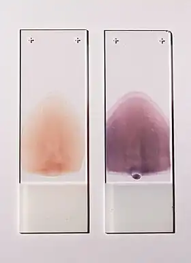 Two push-type peripheral blood smears suitable for characterization of cellular blood elements. Left smear is unstained, right smear is stained with Wright-Giemsa stain.