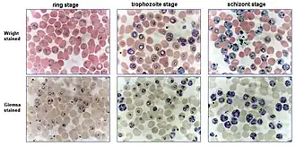Blood smears showing various developmental stages of the malaria parasite Plasmodium falciparum, stained with Wright stain and Giemsa stain