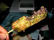 Aside from dinuguan, a native blood sausage known as pinuneg also exists among the Kankanaey people of the highlands of Luzon.[22][23] Cubes of pork blood grilled on skewers is also a common street food throughout the Philippines. These are known colloquially as "betamax" (after its resemblance to Betamax tapes).[24]