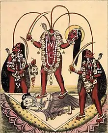 Chinnamasta, a self-decapitated Hindu goddess, is depicted holding her head with three jets of blood spurting out of her bleeding neck, which are drunk by her severed head and two attendants. Saint Miliau, a Christian martyr killed c. 6th century AD, is sometimes represented holding his severed head, as in the retable of the Passion of the Christ at Lampaul-Guimiliau, where blood gushes from his neck.
