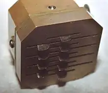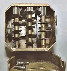 A number of different methods were employed. The most common was phlebotomy, or venesection (often called "breathing a vein"), in which blood was drawn from one or more of the larger external veins, such as those in the forearm or neck. In arteriotomy, an artery was punctured, although generally only in the temples. In scarification (not to be confused with scarification, a method of body modification), the "superficial" vessels were attacked, often using a syringe, a spring-loaded lancet, or a glass cup that contained heated air, producing a vacuum within (see fire cupping). There was also a specific bloodletting tool called a scarificator, used primarily in 19th century medicine. It has a spring-loaded mechanism with gears that snaps the blades out through slits in the front cover and back in, in a circular motion. The case is cast brass, and the mechanism and blades steel. One knife bar gear has slipped teeth, turning the blades in a different direction than those on the other bars. The last photo and the diagram show the depth adjustment bar at the back and sides.