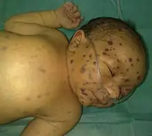 Blueberry muffin baby, also known as extramedullary hematopoiesis, describes a newborn baby with multiple purpura, associated with several non-cancerous and cancerous conditions in which extra blood is produced in the skin.[1] The bumps range from 1-7 mm, do not blanch and have a tendency to occur on the head, neck and trunk.[1] They often fade by three to six weeks after birth, leaving brownish marks.[3] When due to a cancer, the bumps tend to be fewer, firmer and larger.[2]