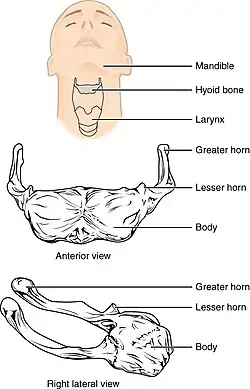 The greater and lesser horns (Latin: cornua) are two sections of bone that project from each side of the hyoid.