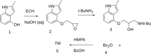 The reaction of 4-Hydroxy-2-methylindole [35320-67-3] (1) with epichlorohydrin in the presence of lye led to 2-methyl-4-(oxiran-2-ylmethoxy)-1H-indole [62119-47-5] (2). Addition of tert-butylamine led to 4-(2-Hydroxy-3-tert-butylaminopropoxy)-2-methylindole [23869-98-9] (3). Ester formation with benzoic anhydride [93-97-0] (4) in the presence of hexamethylphosphoric acid triamide [680-31-9] completed the synthesis of Bopindolol (5).