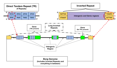 Borgs range from 0.66-0.92 Mbp in length, larger than the genomes of any known archaeal viruses.[4] The sizes of Borg genomes are more characteristic of eukaryote-specific double-stranded DNA viruses from the phylum Nucleocytoviricota, also known as nucleocytoplasmic large DNA viruses (NCLDV), which can surpass 2.5 Mbp.[4][9] Tandem direct repeat sequences are prevalent throughout Borg genomes, and they are terminated by inverted repeats. This differs from the megaplasmids of some bacteria, which carry interspaced repeats and usually are not responsible for encoding necessary genes.[4]