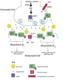 Bornaprine is an antimuscarinic agent that nonselectively antagonizes muscarinic acetylcholine receptors, M1 and M2.[8] Bornaprine has been characterized as a very potent anticholinergic medication and further clinical trials have indicated its effectiveness at treating parkinsonian tremors.[9][7][10][11] Bornaprine also has a pa2 value (affinity of antagonist for receptor) of 7.27 ± 0.21 indicating a high potency.[12]