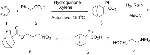 Bornaprine can be synthesized beginning with atropic acid (2-phenyl acrylic acid, 1).[17] A Diels-Alder reaction with cyclopentadiene (2) gives the bicyclic compound 3. Catalytic hydrogenation over Raney nickel gives 2-phenylbicyclo[2.2.1]heptane-2-carboxylic acid (5). Conversion of the acid to the acid chloride and esterification with 3-diethylaminopropanol (4) completes the synthesis of bornaprine (6).
