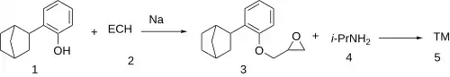 The reaction between 2-(Bicyclo[2.2.1]hept-2-yl)phenol [17152-43-1] (1) and epichlorohydrin [106-89-8] (2) in the presence of sodium metal gives (3). Opening of the oxirane by treatment with isopropylamine [75-31-0] (4) completed the synthesis of Bornaprolol (5).