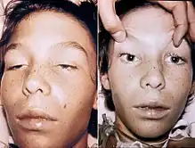 A 14-year-old boy with botulism, characterised by weakness of the eye muscles and the drooping eyelids shown in the left image, and dilated and non-moving pupils shown in the right image. This youth was fully conscious.